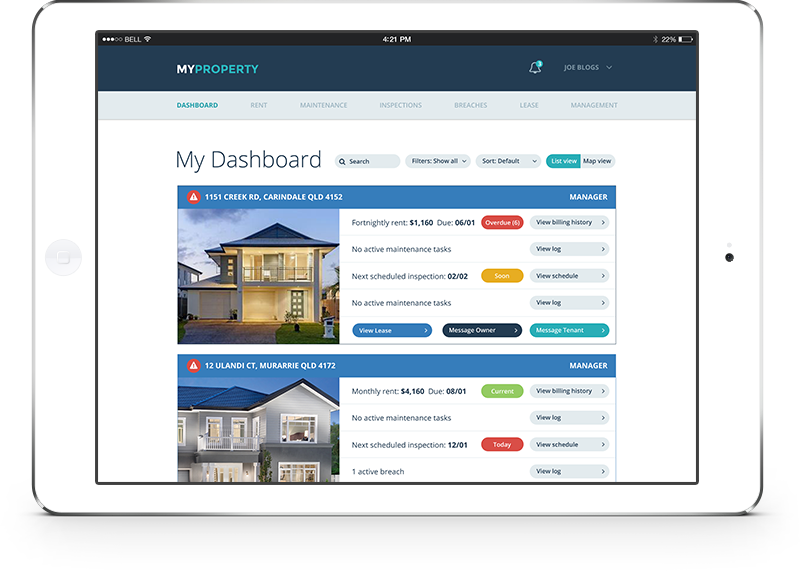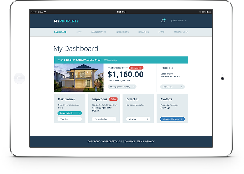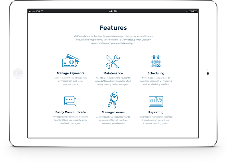 My Property is an online tool for property managers, home owners and tenants alike. The interface automates processes and collates all necessary information in an intuitive and clean design. Through My Property , users can view leases, pay rent, log any repairs and contact their property managers.